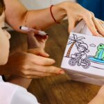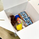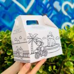 O kit confeiteiro contém: 2 brownies 6x6cm+ saco de brigadeiro tradicional (90g) + tubete com m&m + brinquedo surpresa ( bichinho do mar ou elástico de geleca) na caixa temática com desenhos para pintar!