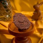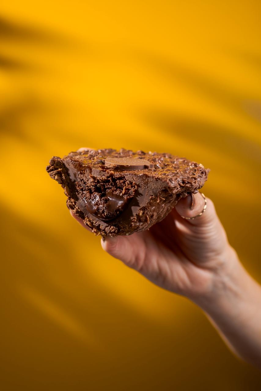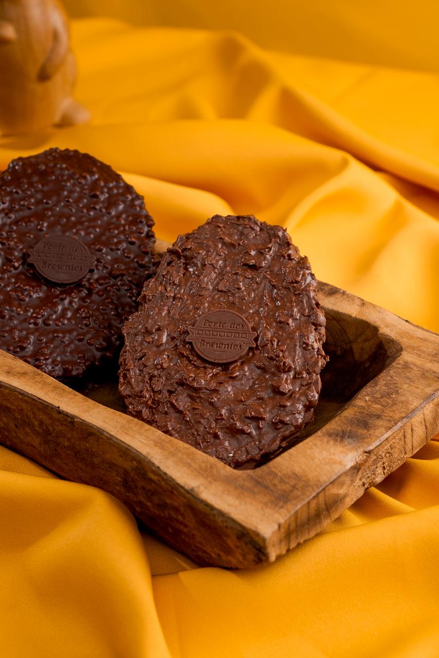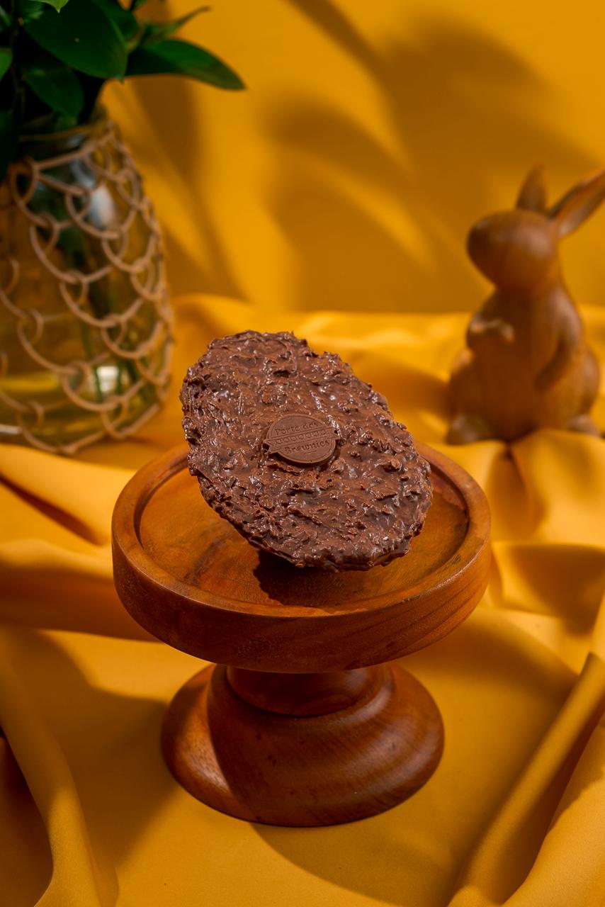 Ovo casca ao leite, coberto com chocolate ao leite crunchy (chocolate ao leite com nutella e Pailleté Feuilletine feito na casa) , meia banda recheado com brigadeiro tradicional molinho e brownie , fechado com chocolate ao leite crunchy, peso aprox 370g