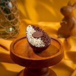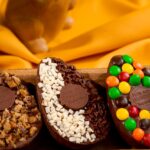 Ovo casca ao leite , meia banda recheado com brigadeiro tradicional , brigadeiro de laka e brownie , fechado com chocolate ao leite e confeitado com granulado ao leite e branco, peso aprox 190g